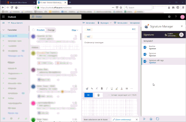 Je kunt ook een tijdelijke regel toevoegen aan je handtekening. Dit kan in de vorm van tekst en/of een afbeelding zijn, eventueel in combinatie met een weblink. Scroll naar beneden om hier een voorbeeld van te bekijken.